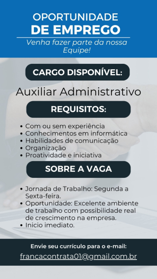 Escritório contrata profissional para atuar com emissão de NF, fechamento de caixas e demais rotinas administrativas. Necessário ter experiência comprovada na área. Interessados enviar currículo para: contratafranca2021@gmail.com
